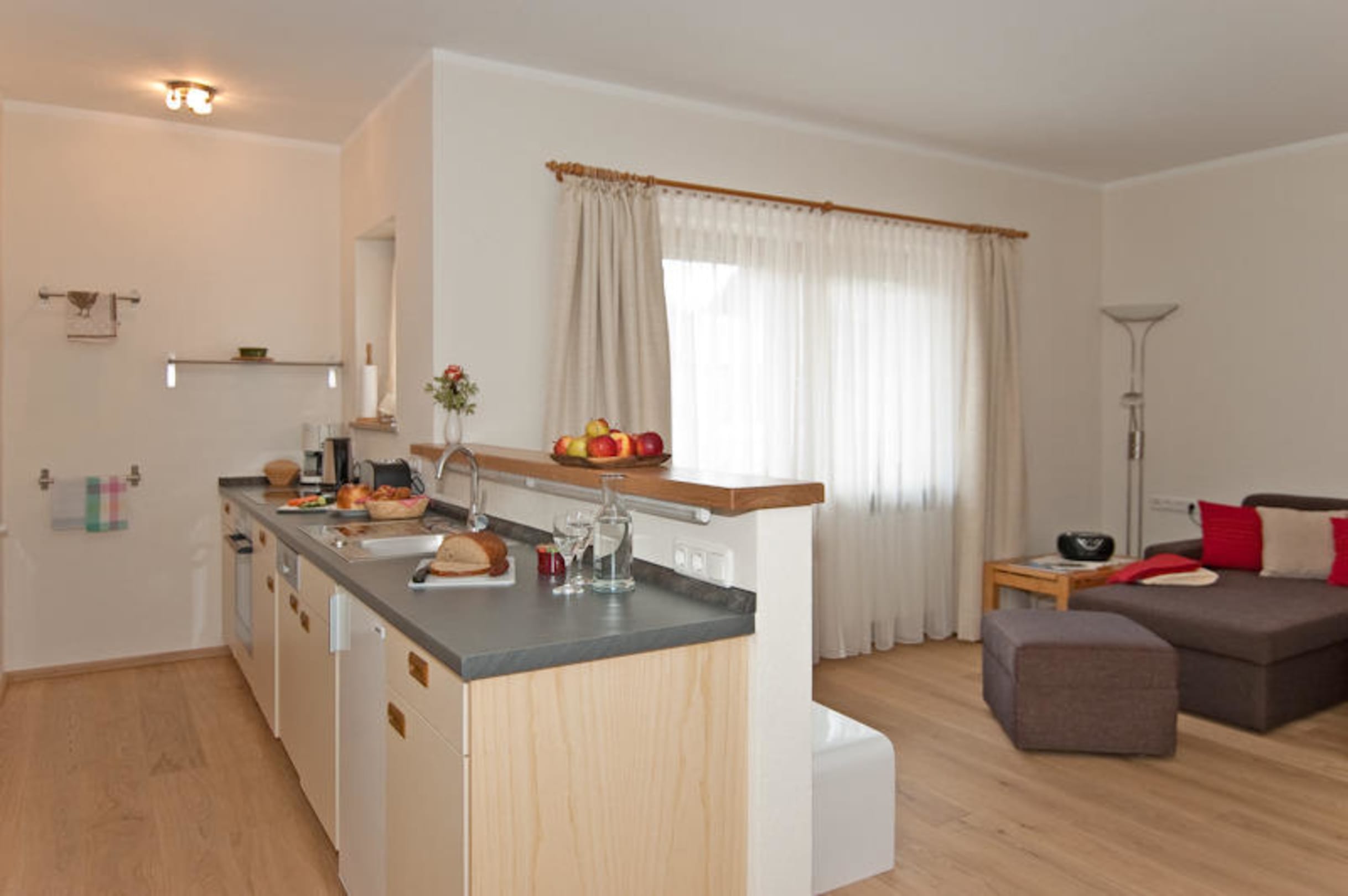 Wohnzimmer mit offener Küche (4-Platten-Herd, Backofen)