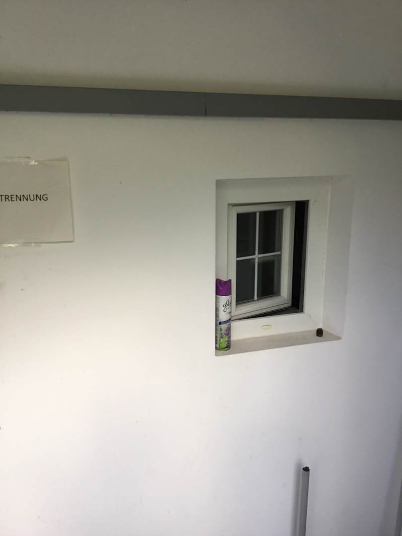 Badefenster der Parterrewohnung Blick von außen, gleichzeitig ist es der Platz der Mülltonnen.