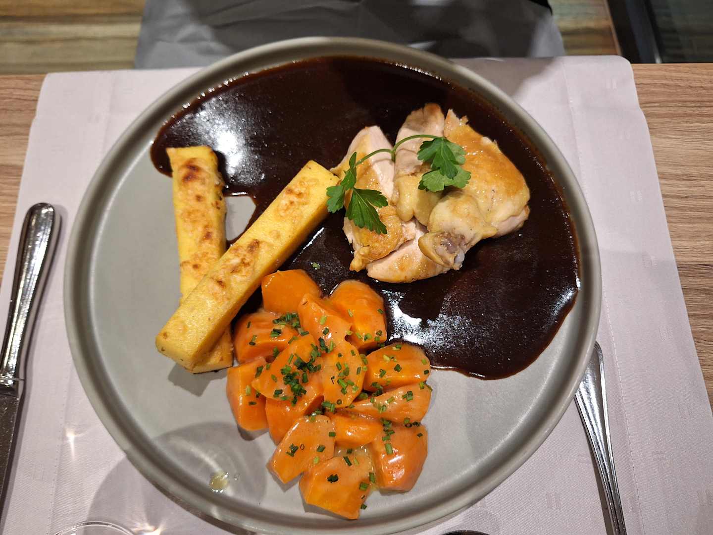 Maispoulade mit Karottengemüse und Polentasticks