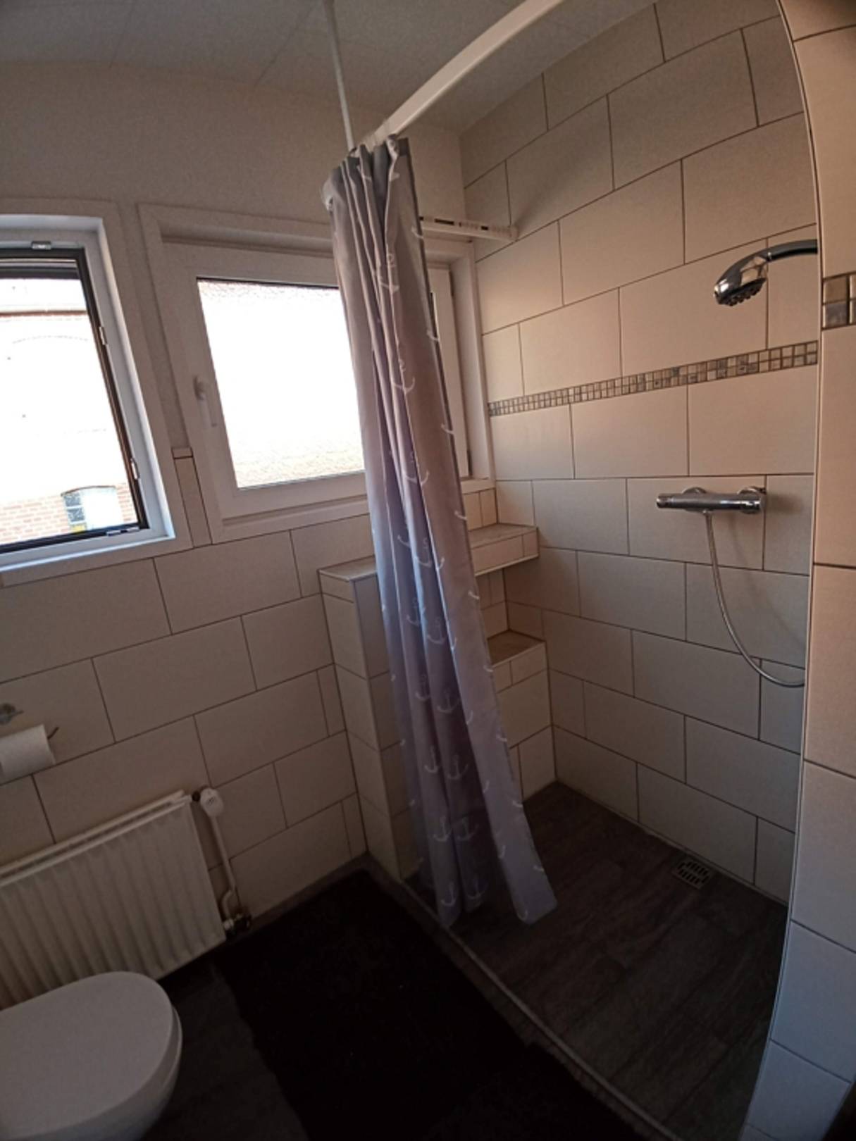 Badezimmer mit Waschbecken, Toilette und barierefreier Dusche