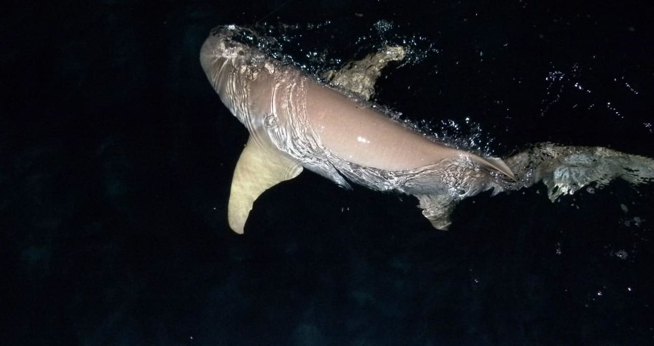 Beim NachtangelnDieser Hai hat beim Nachtangeln angebissen. Selbstverständlich nicht geplant. Er wurde auch sofort wieder von der Leine gelassen!