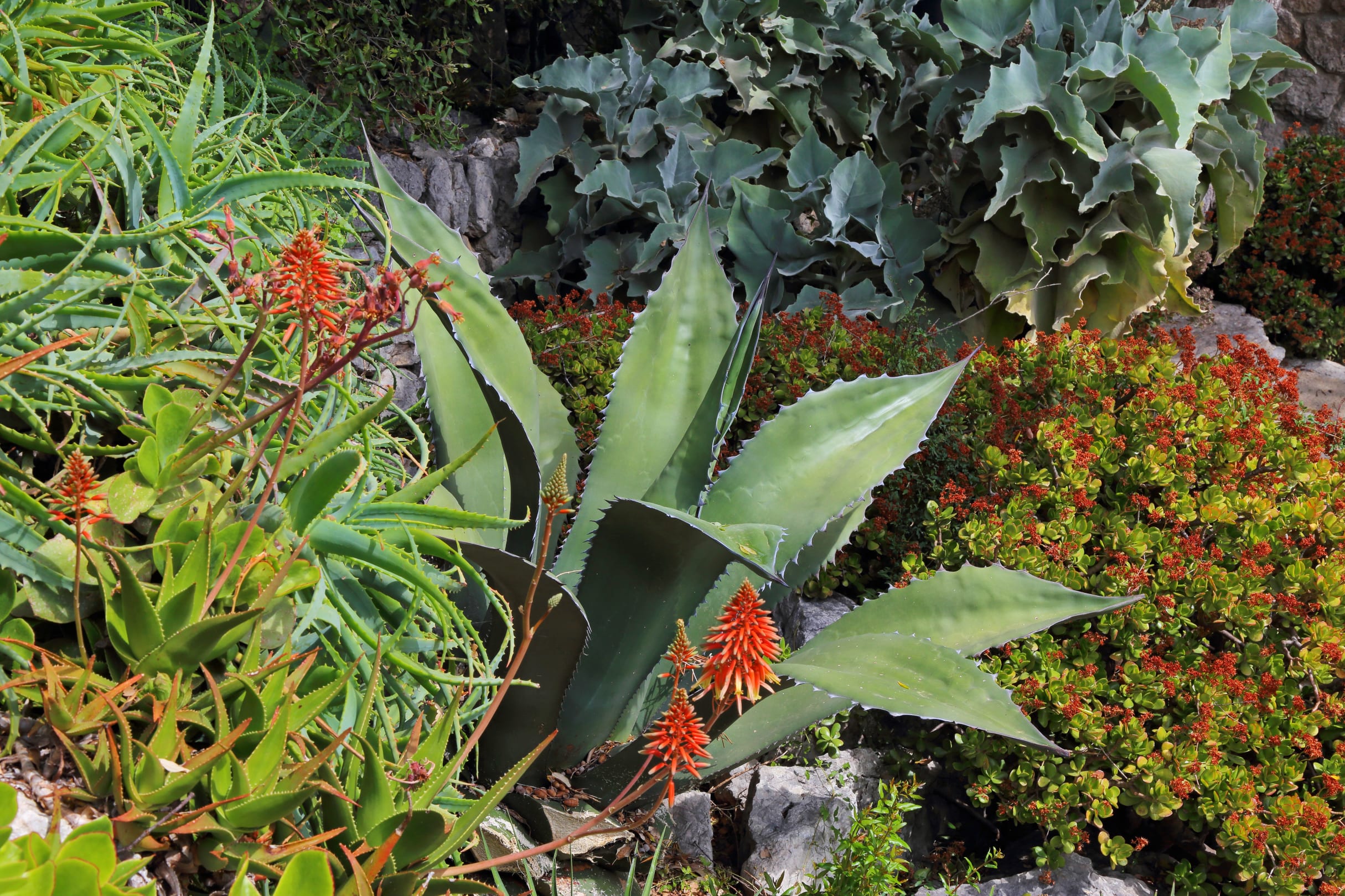 Gartenanlage2018: Ein anderes kreatives Pflanzenarrangement in der unterhalb des Telefonierplatzes mit Aloe Vera, Agave und anderen Spezies.