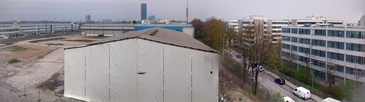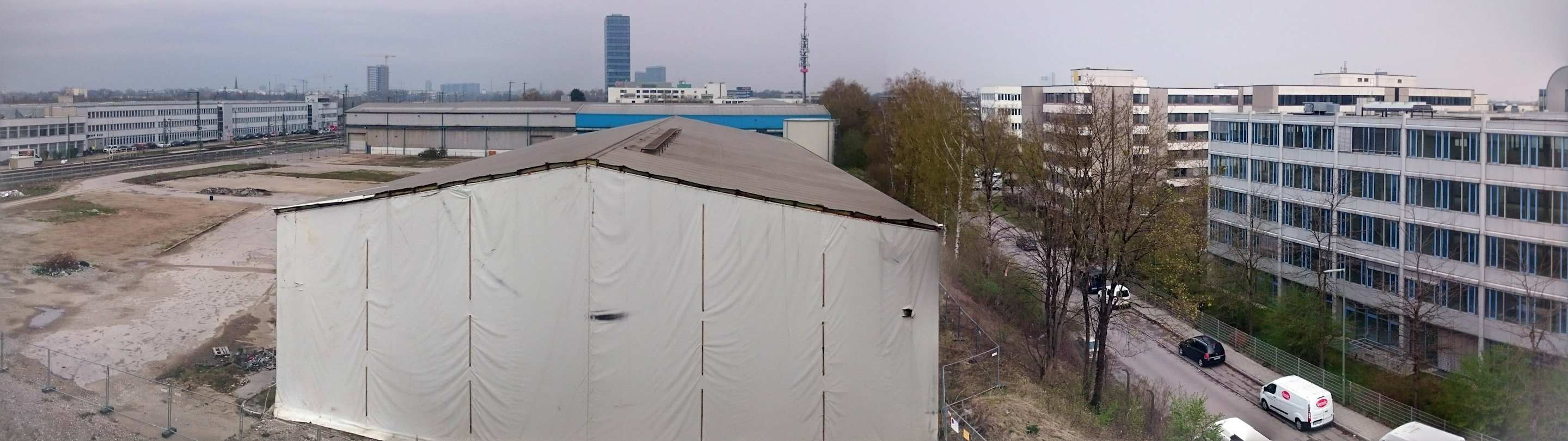 Ausblick auf andere Hotels, ein Zelt und die Bahnanlagen