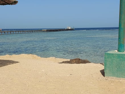 Strandder hellere Teil ist ausserordentlich flach, but mit Badeschuhen zu betreten, erst hinten am Ende des Stegs kann man schwimmen oder schnorcheln