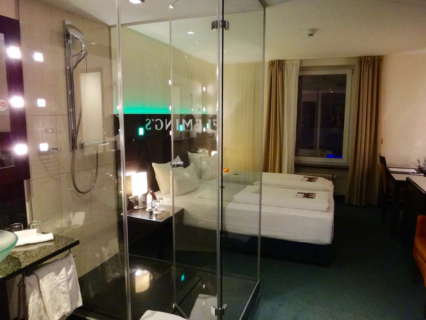 Verglaste Dusche mitten im Zimmer: sehr bequem!