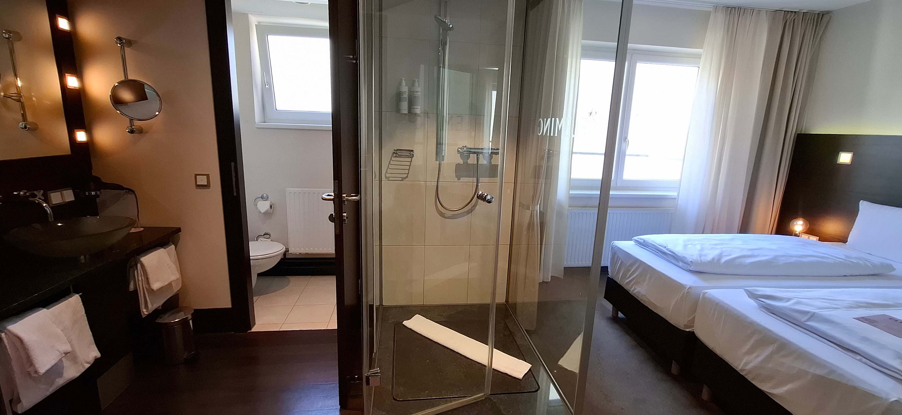 Zimmer mit Dusche und Waschbecken. Toilette in einem separaten Raum.