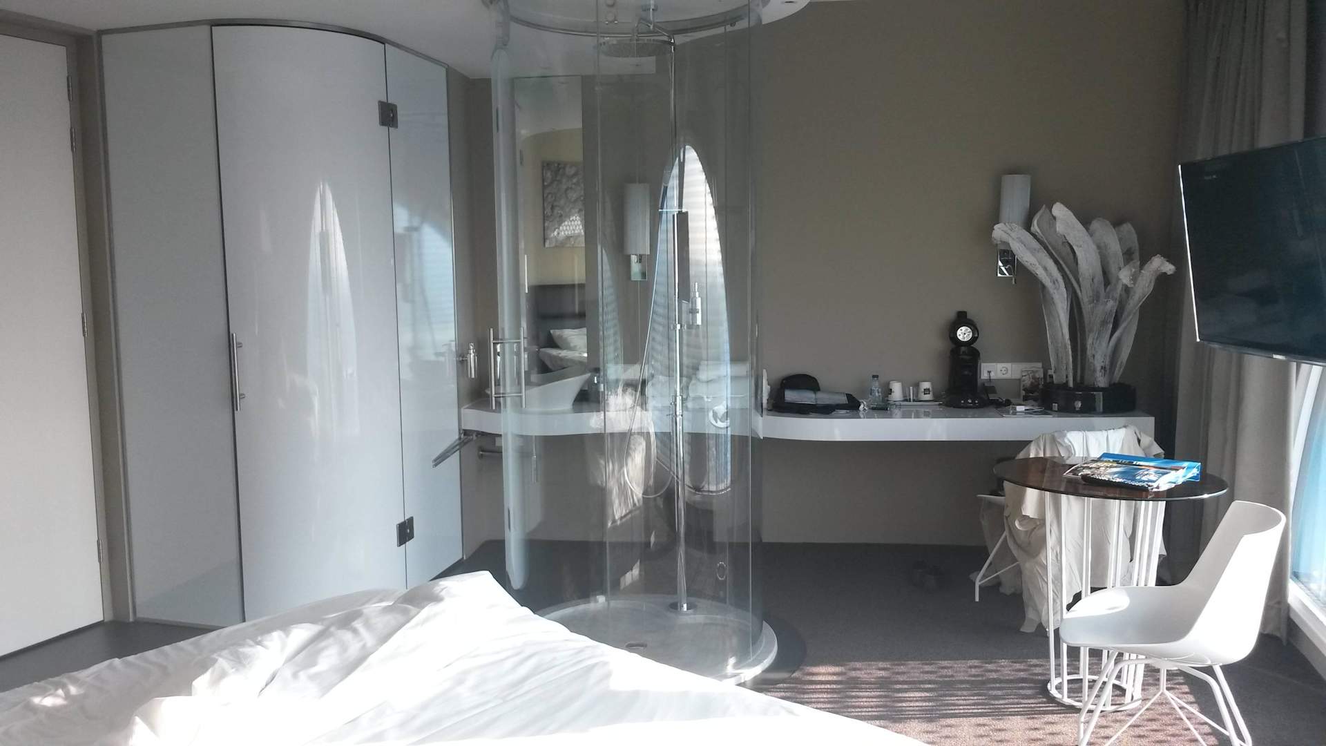 Dusch-Säule im ZimmerDie durchsichtige Dusch-Säule mitten im Zimmer, dahinter das offene "Badezimmer". Hinter der Milchglasscheibe links die Toilette.
