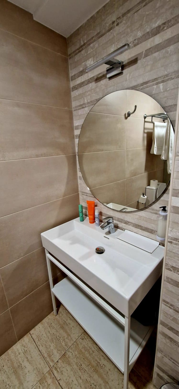 Schönes Badezimmer mit großen Waschbecken und großer Ablage darunter!