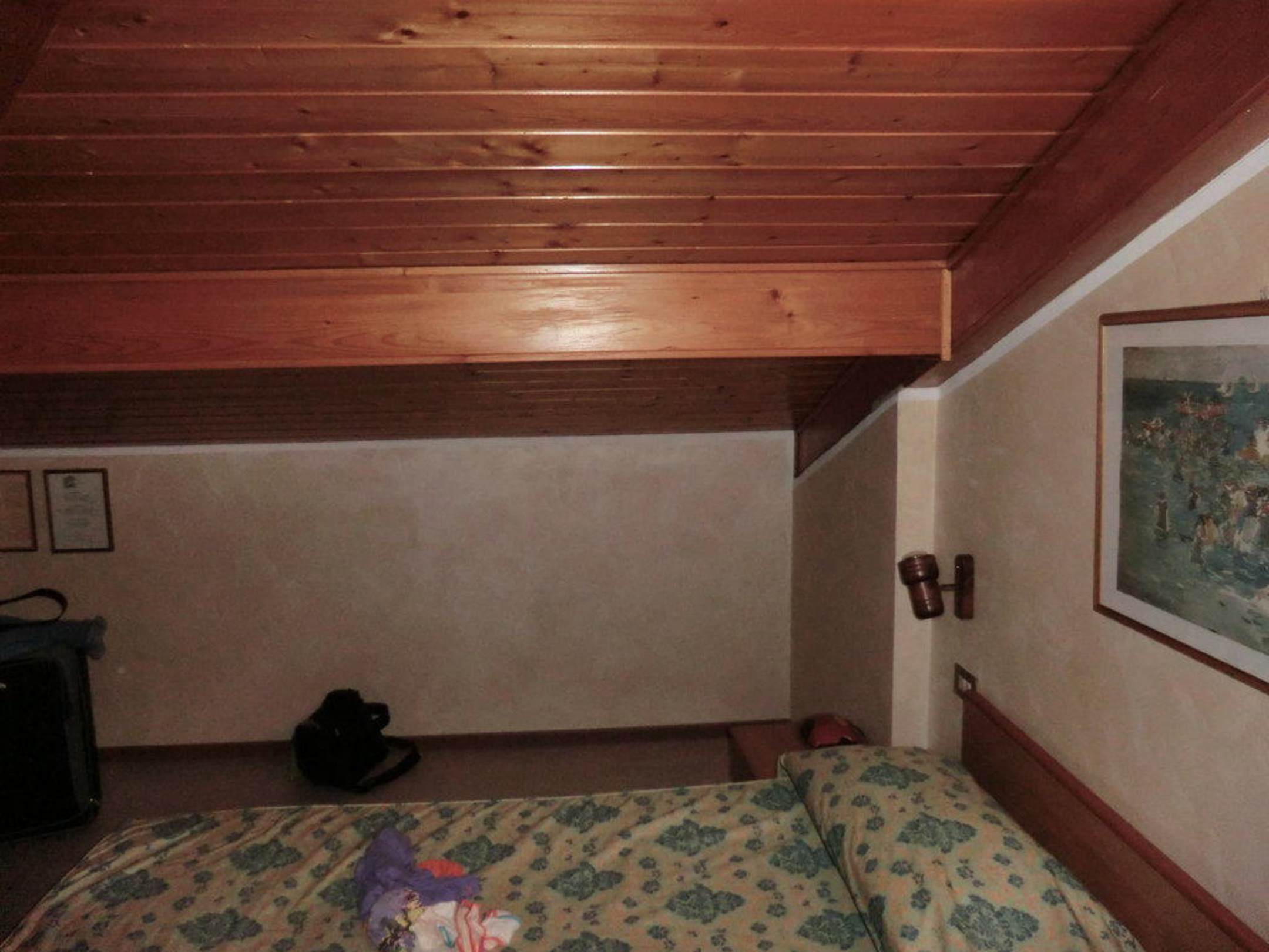 Mansardenzimmer 1,25 - 2,45 mdas Mansardenzimmer hat hervorstehende Balken, z.b. über der rechte Bettseite, man kann mit 1,60 m nicht darunter stehen!
