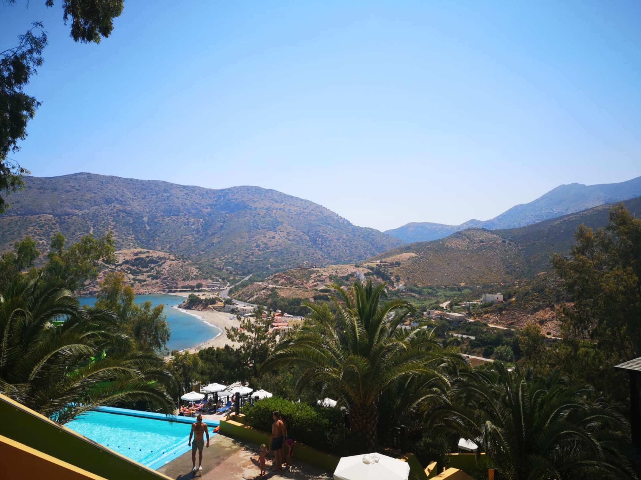 Ausblick vom Wasserpark ganz oben in der Anlage auf Strand