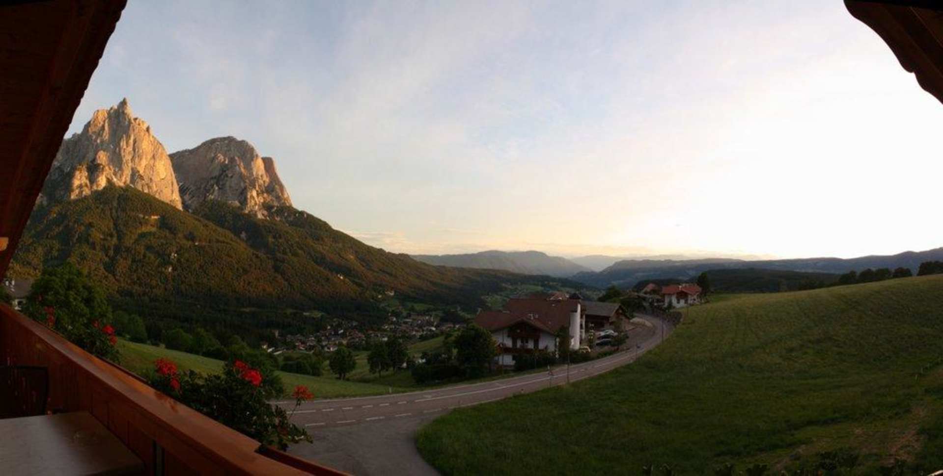 Links die Schlernspitze und die Straße nach Seis bzw. Kastelruth.