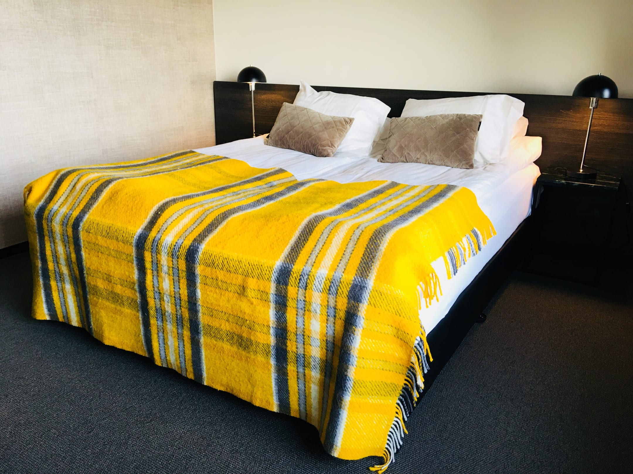 ZimmerDie Betten sind sehr gemütlich. Ablageflächen und Steckdosen befinden sich in unmittelbarer Nähe zum Bett.
