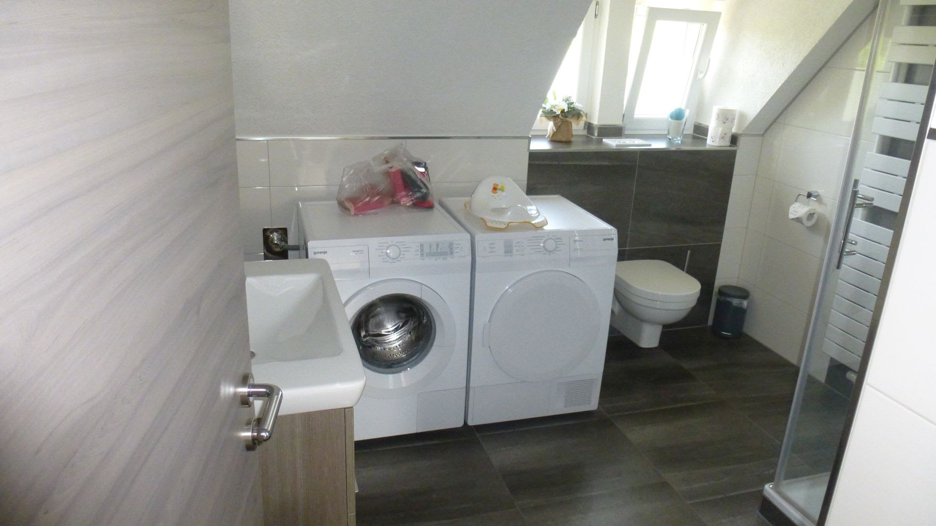 Badezimmer mit Waschmaschine und Trockner