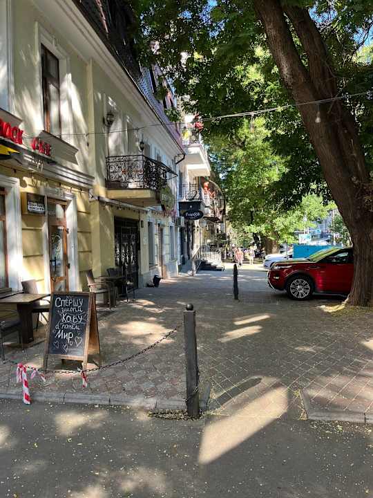 AußenansichtStraße in dem das Hotel liegt. Das Hotel ist das Gebäude in der Bildmitte. Mit roten Fröschen auf den Balkonen.