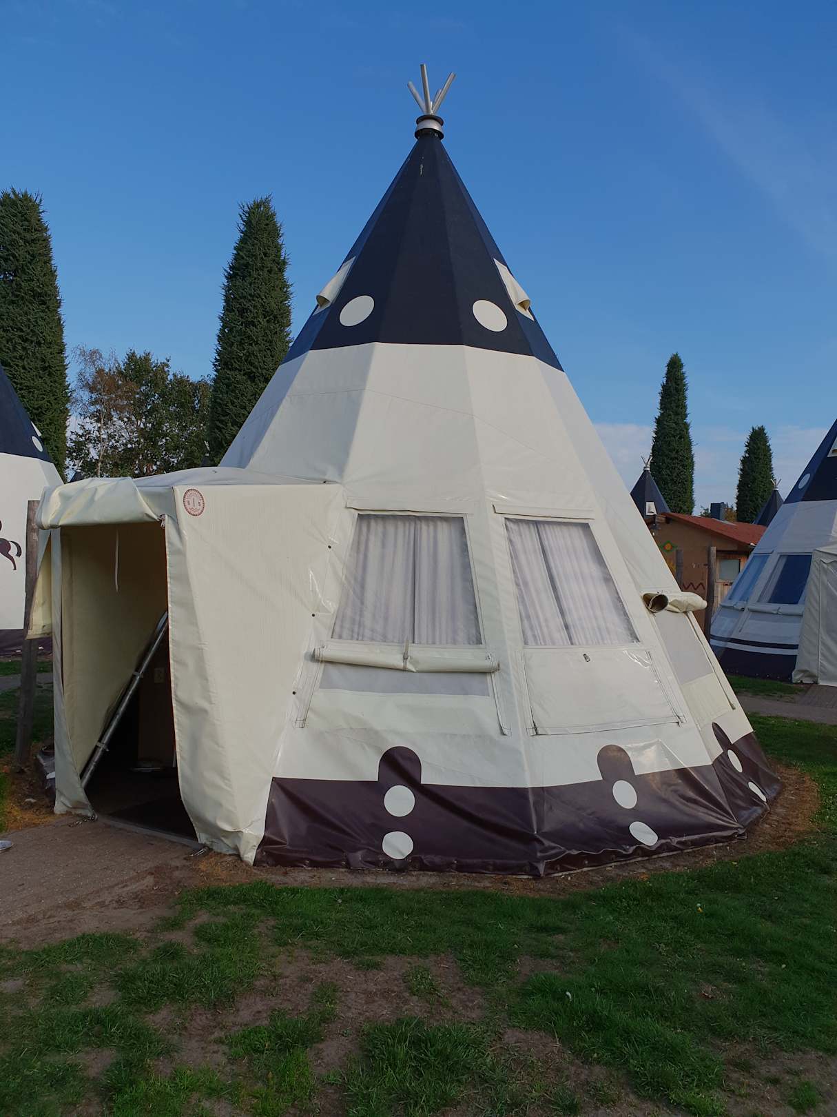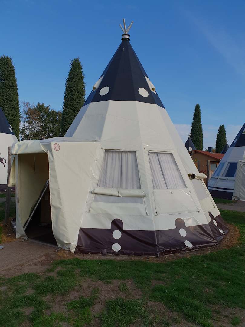 Wigwam Deluxe für bis zu 2 Erwachsene und 4 Kinder geeignet. Betten, Küche mit den nötigsten Utensilien, kleiner TV und Heizungen vorhanden. Jedes Wigwam hat sein eigenes Bad Häuschen für sich! Sehr schön!