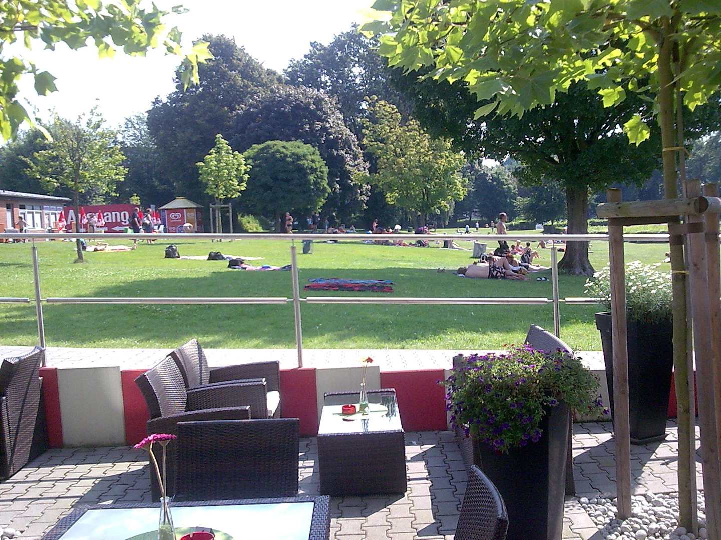 Bild von der Frühstücksterrasse Richtung Freibad