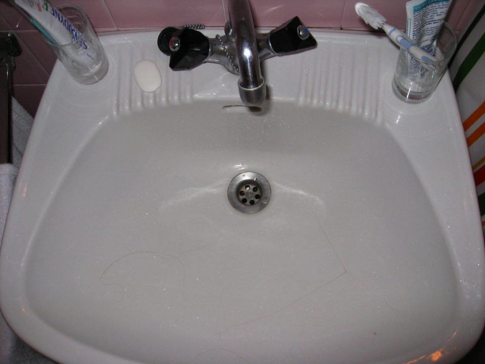 Waschbecken mit Sprung und veralteter, verkalkter Armatur