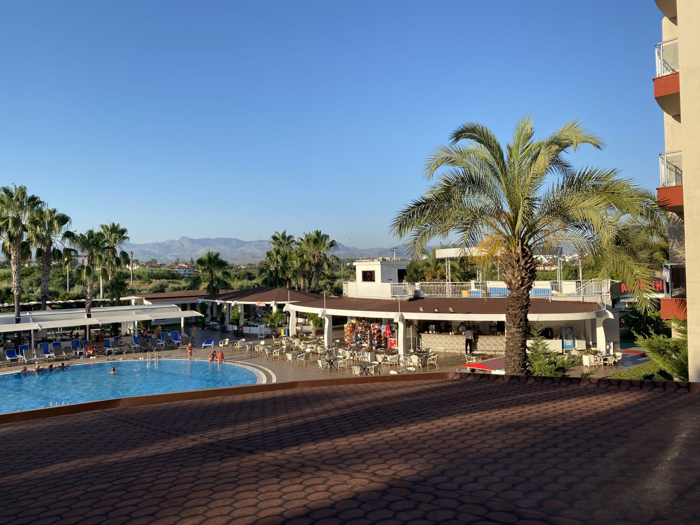 PoolBlick vom Balkon der Lobby. Zu sehen der Pool rechts die Pool Bar und im Hintergrund einen Teil des Liegen Bereichs.