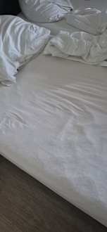 Matratze durchgelegen, Kissen ohne Füllung- einfach leer, schäbig, Holz aufgequollen