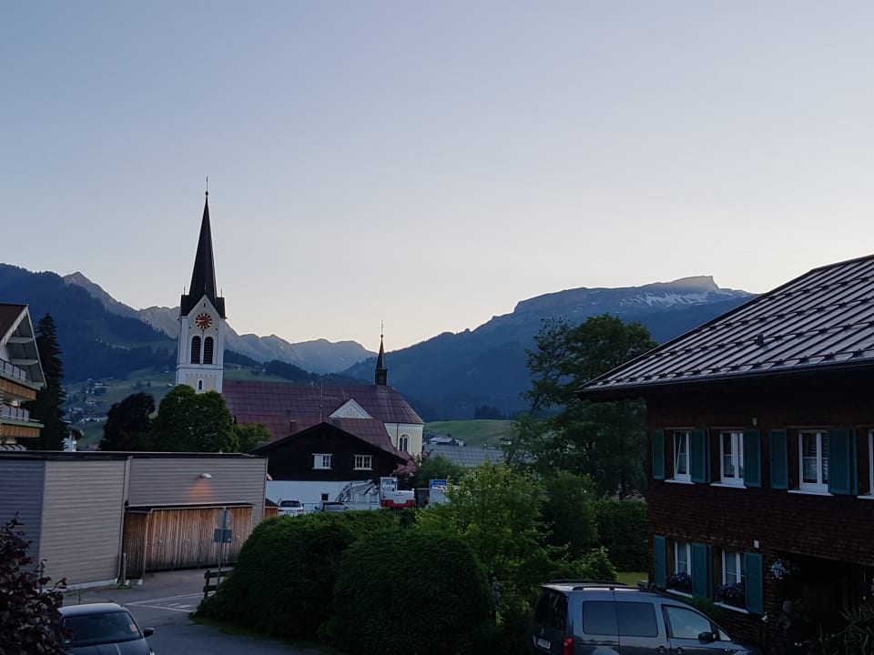 Blick vom Zimmer auf Ifen u Walmendinger Horn u Kirche von Riezlern
