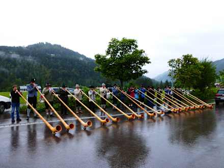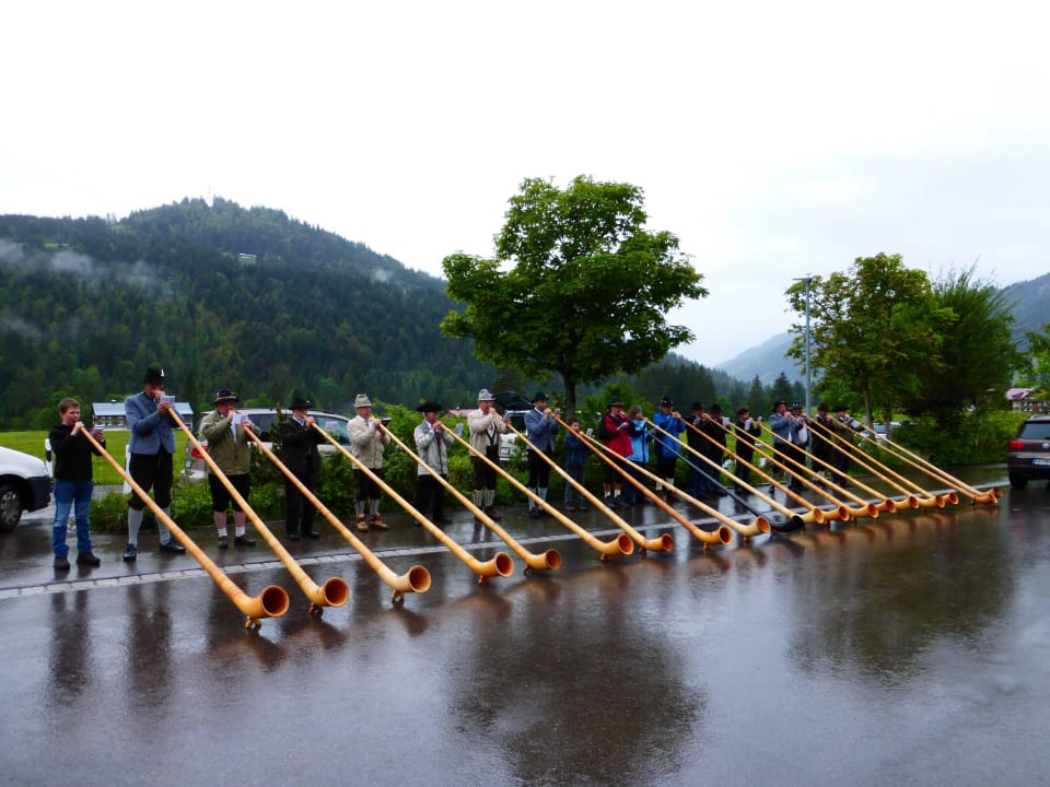 Alphornbläser spielen vorm Haus