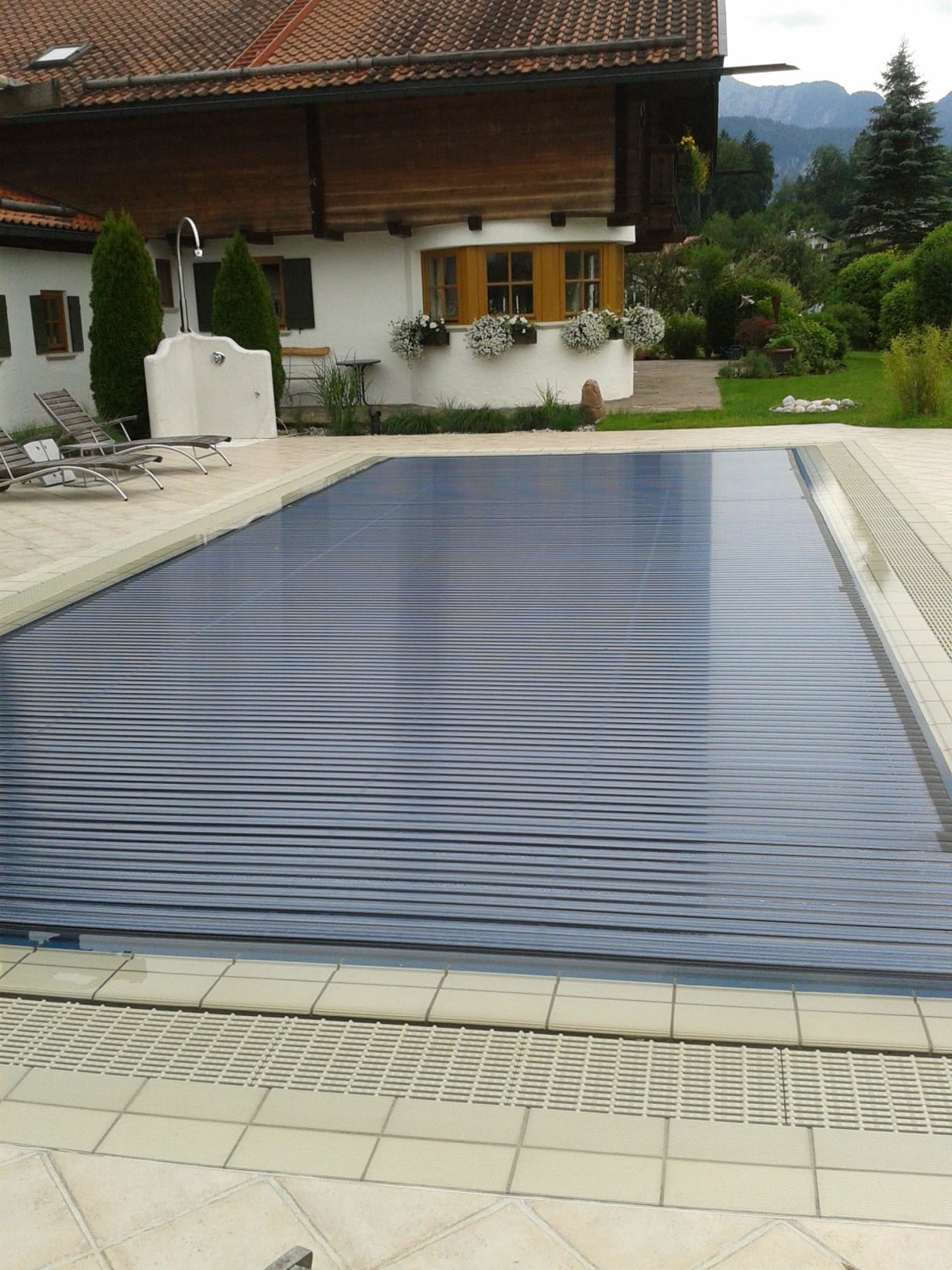 Der Pool wird mit einer Solarabdeckung beheizt.