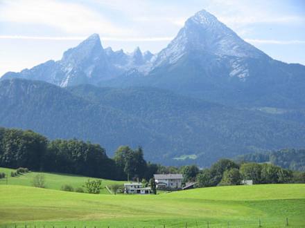 In der Bildmitte das Haus Elvira, im Hintergrund der Watzmann