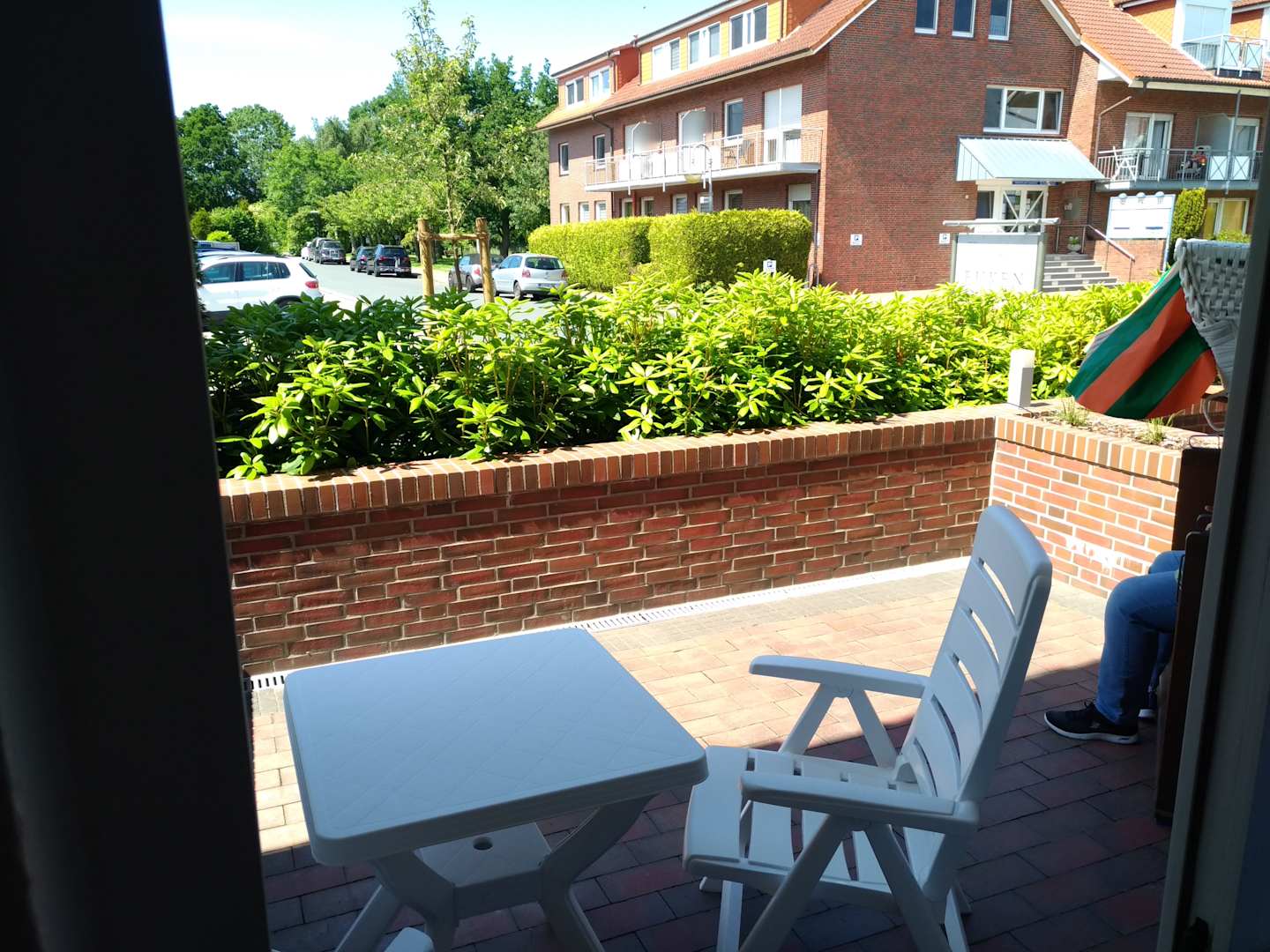Balkon mit Sitzecke, rechts außen Strandkorb