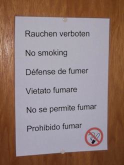 Eines der NichtraucherschilderDer Hinweis auf das Rauchverbot ist deutlich und nicht zu übersehen. Wird durch die vielen Schilder aber nicht besser.