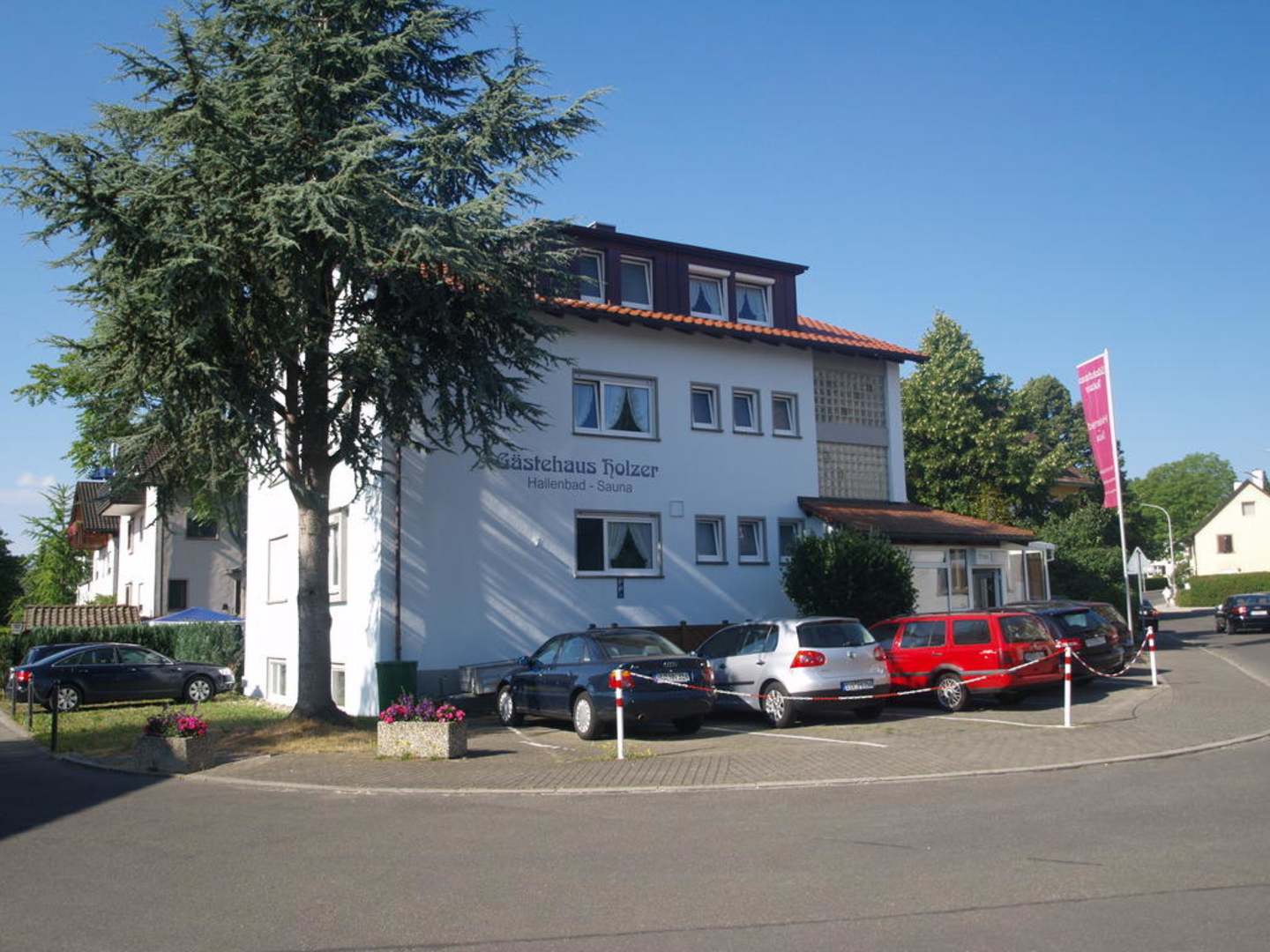 Das Gästehaus mit den am Haus gelegenen Parkplätzen.