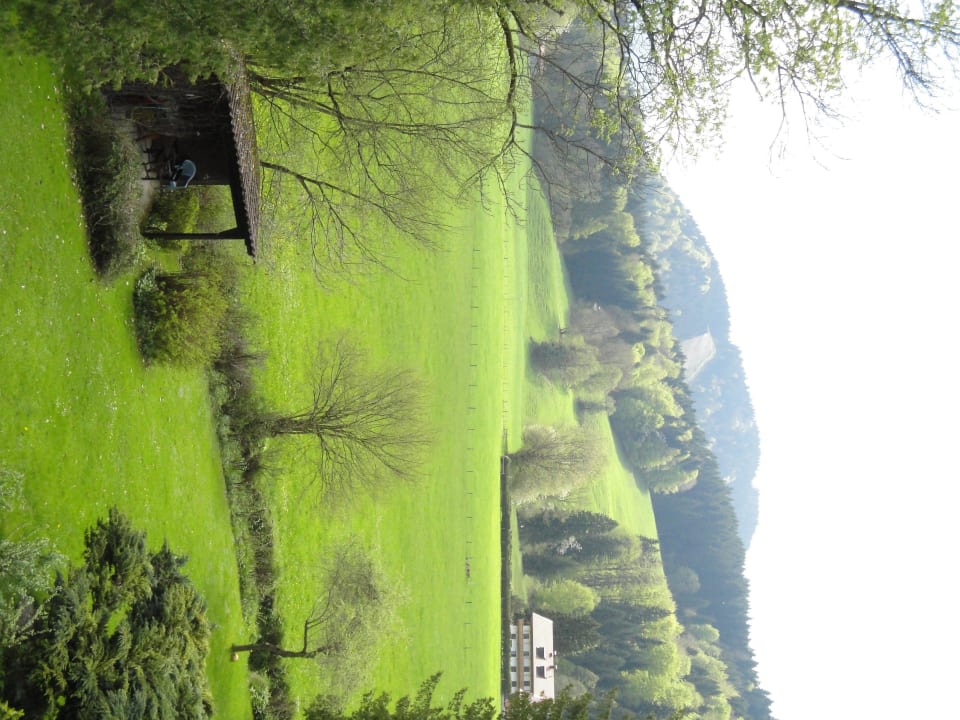 Blick von Balkon auf Wiesen und Berge