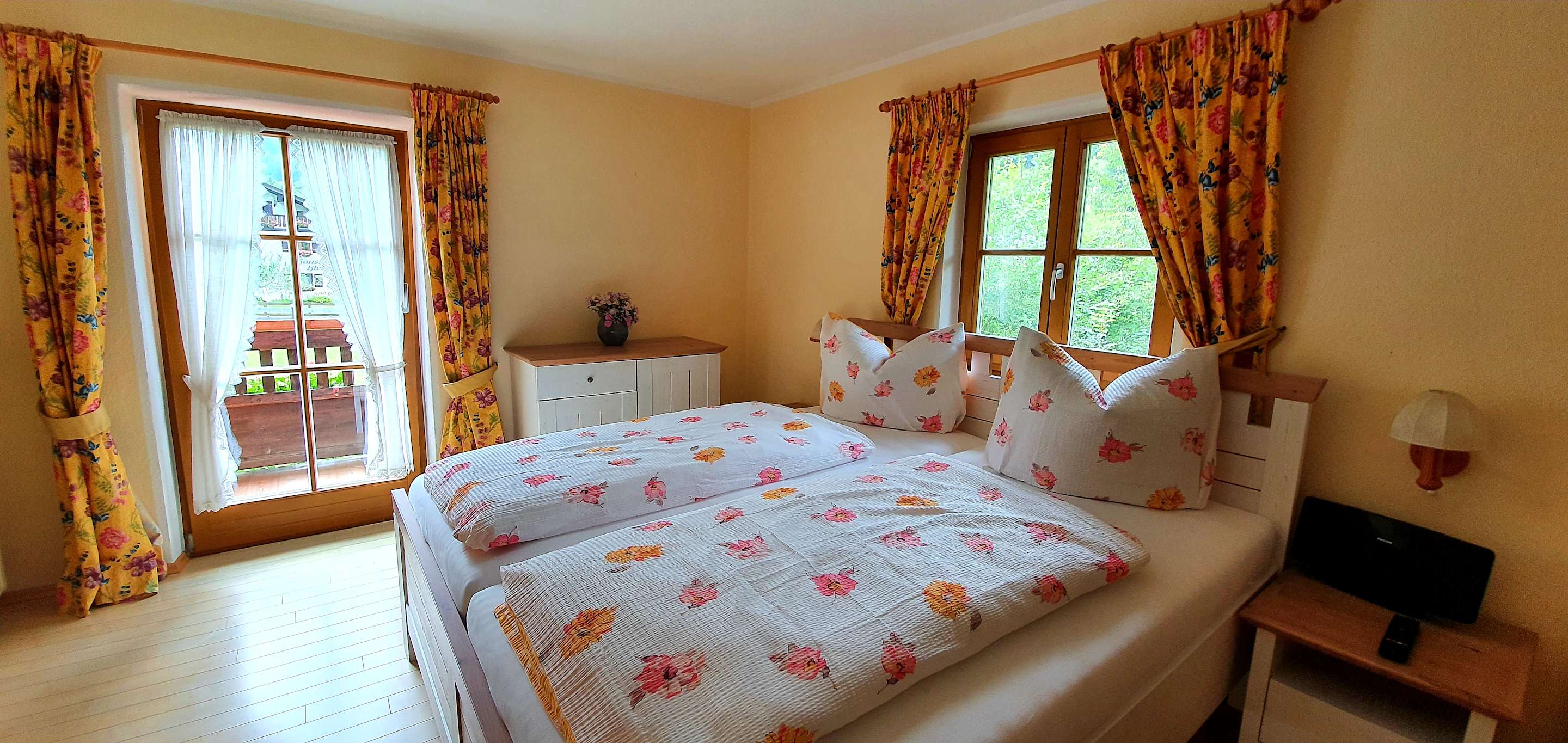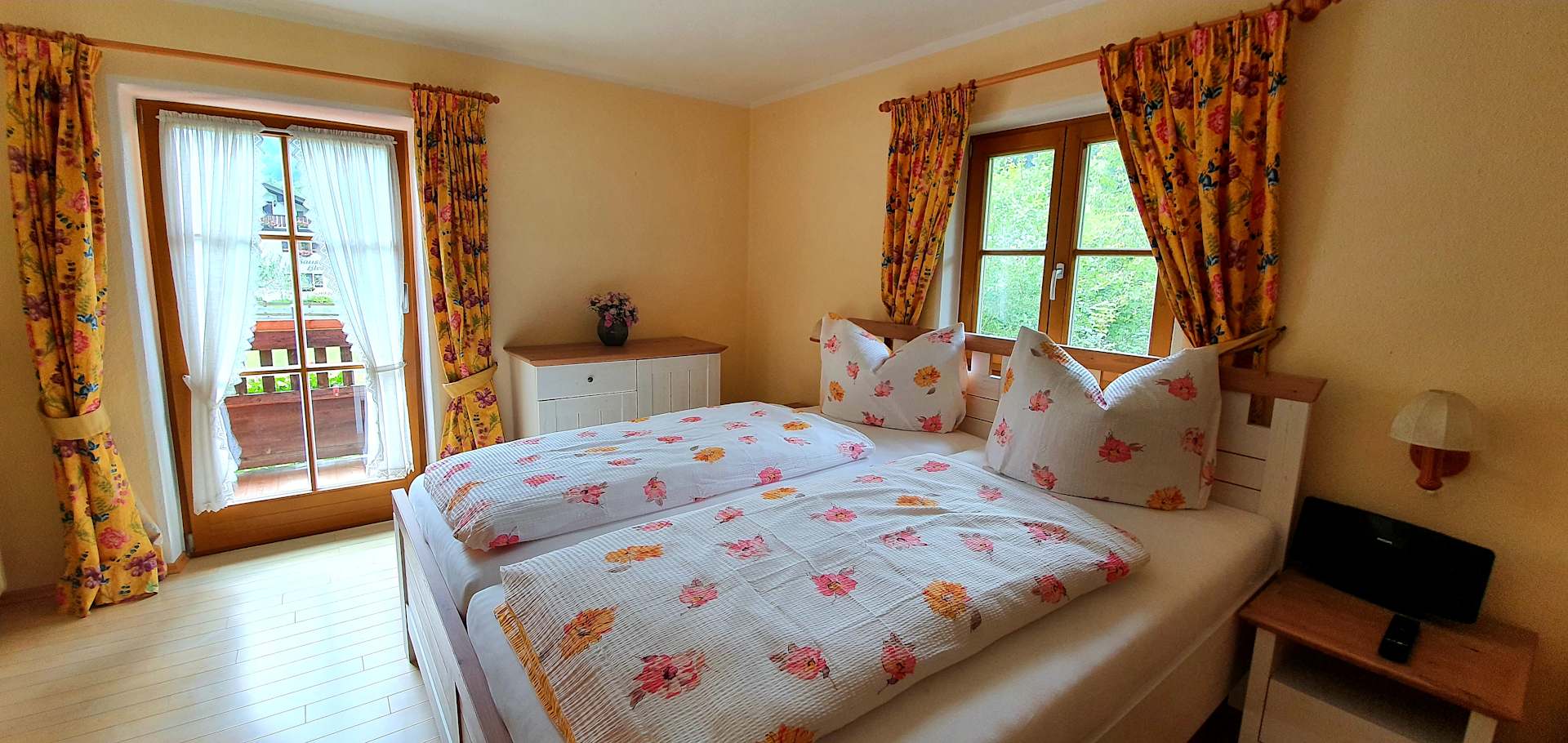 ZimmerSchlafzimmer der Ferienwohnung Bergblick mit Komfortbett und sehr großem Balkon, mit herrlichem Blick auf die Berge.