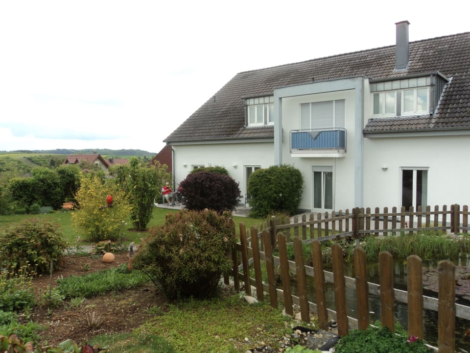 Blick v.Gartenbereich auf den hinteren Bereich des Gästehauses Beate 6 Arthur Korz/Feilbingert, wo die Gäste sich auch auf ihren Terrassen es sich gemütlich machen können .....