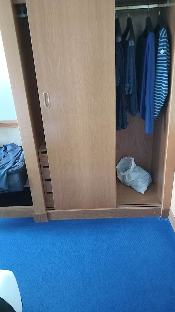 Beim Schrank ließ sich nur die rechte Tür öffnen, die linke klemmt. Es gab ganze 6 Kleiderbügel, wovon 2 schon für Jacken gebraucht wurden mangels Haken. Also hatte jeder einen Hosenbügel bzw. für ein Oberteil. Alles andere blieb im Koffer.