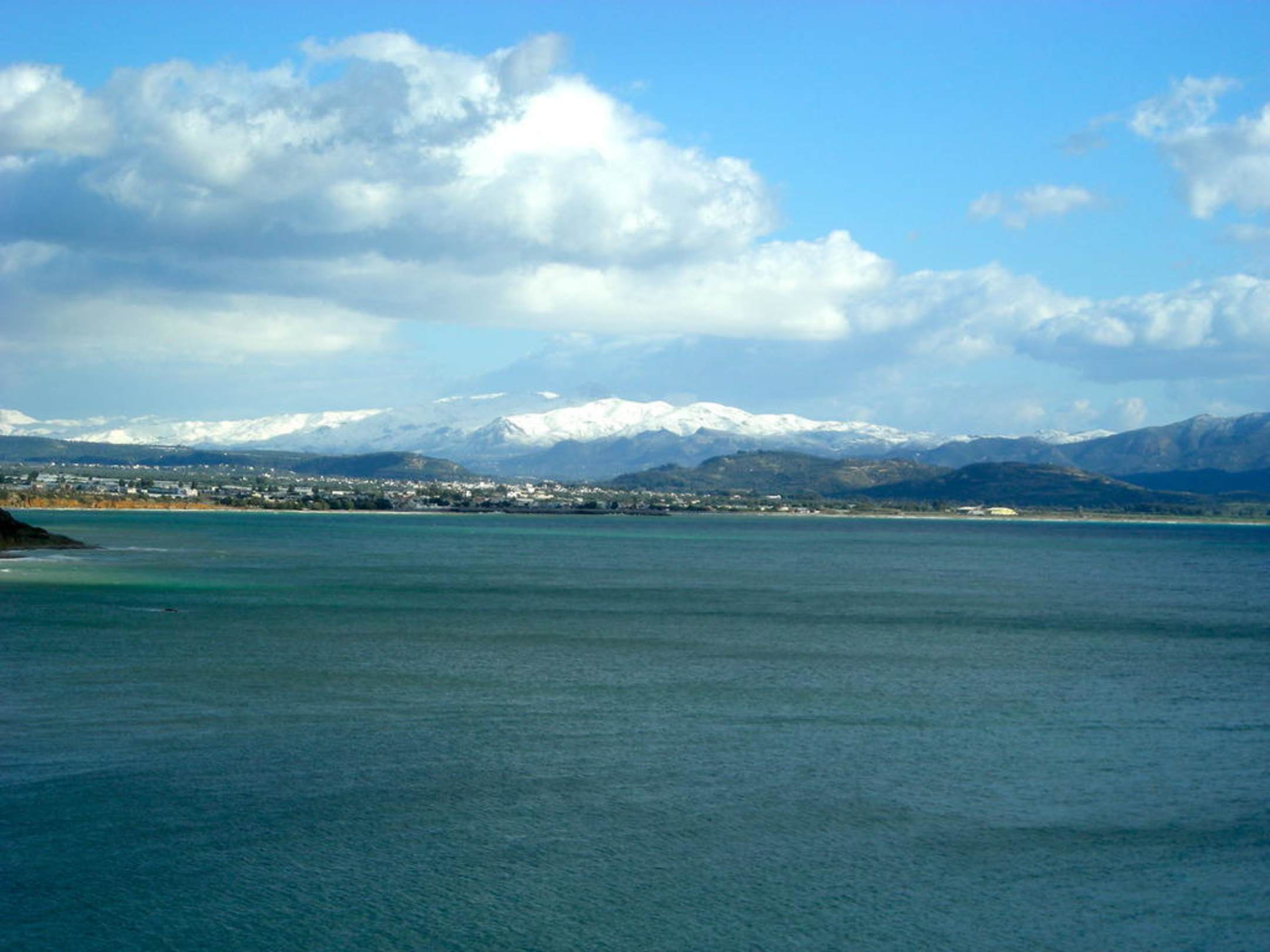 Blick vom Balkon auf das verschneite Asteroussia-Gebirge