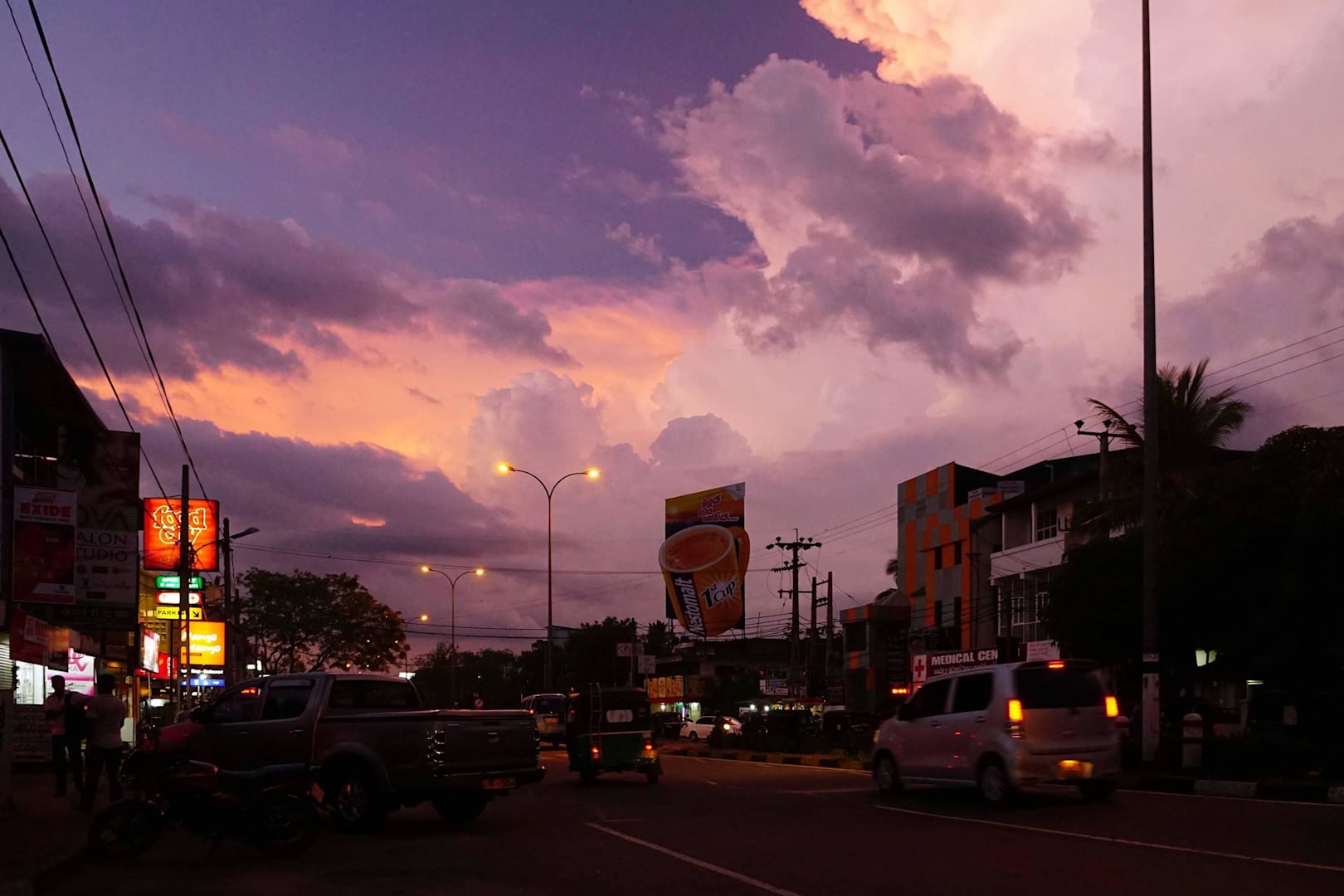 Główna ulica miasta ze sklepami i barami