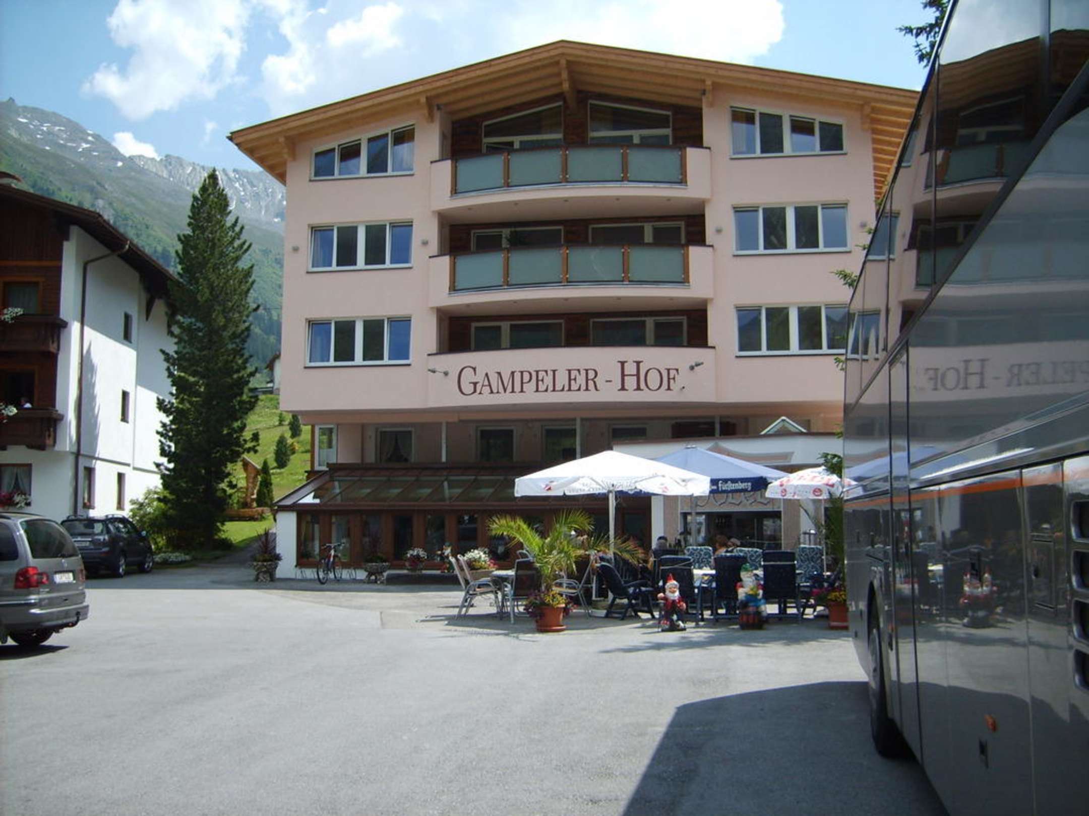 Gampeler Hof mit neuer, moderner Fassade und Biergarten.