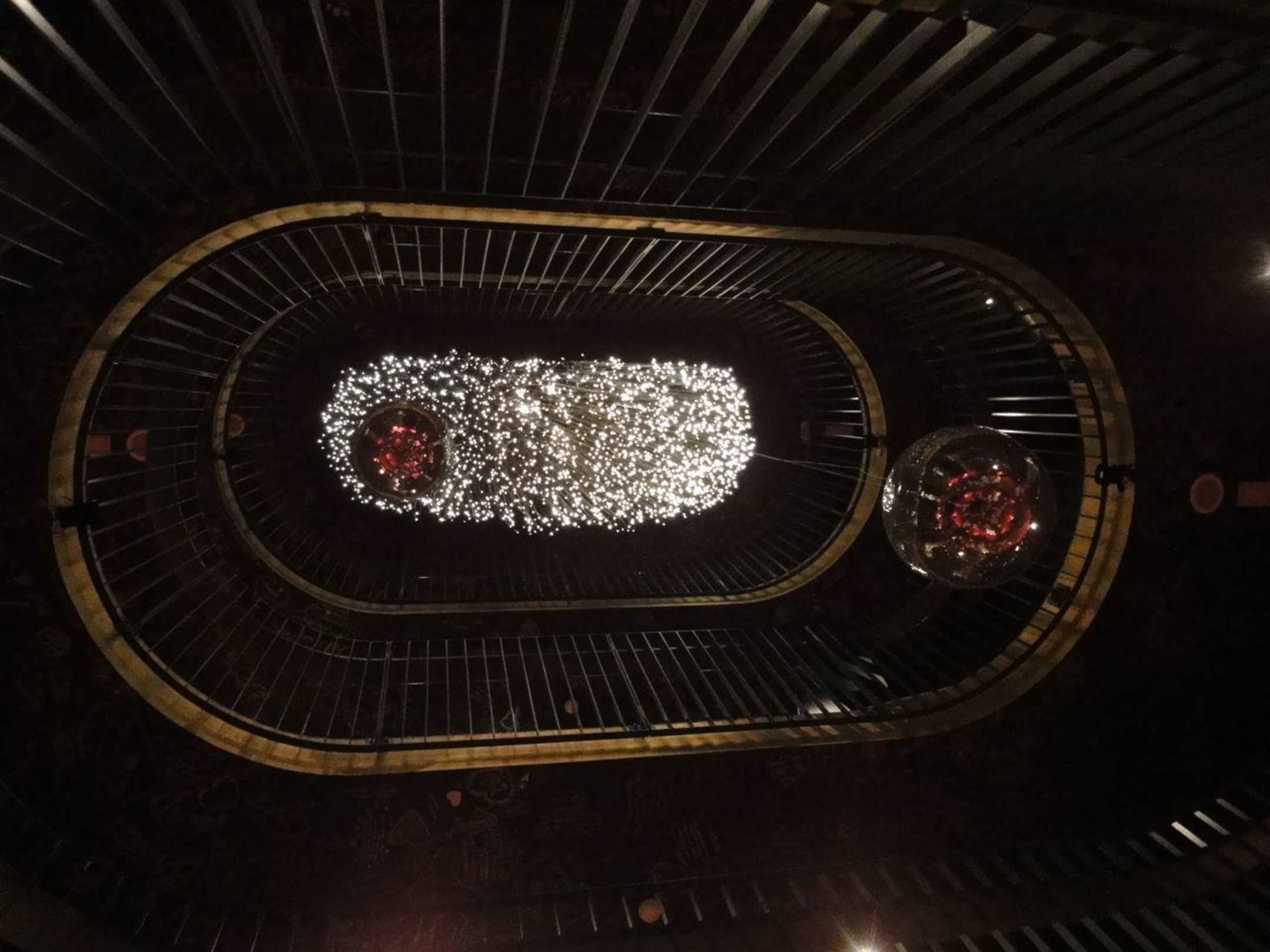 Tolle Beleuchtung des 3stöckigen Treppenhauses von unten betrachtet.