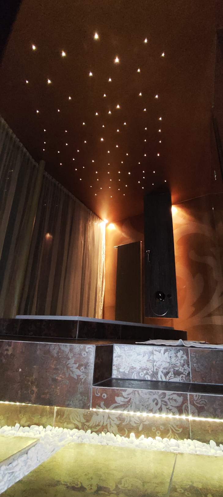 Im Boden eingelassene Whirlpoolwanne mit Sternenhimmel und Blick nach aussen