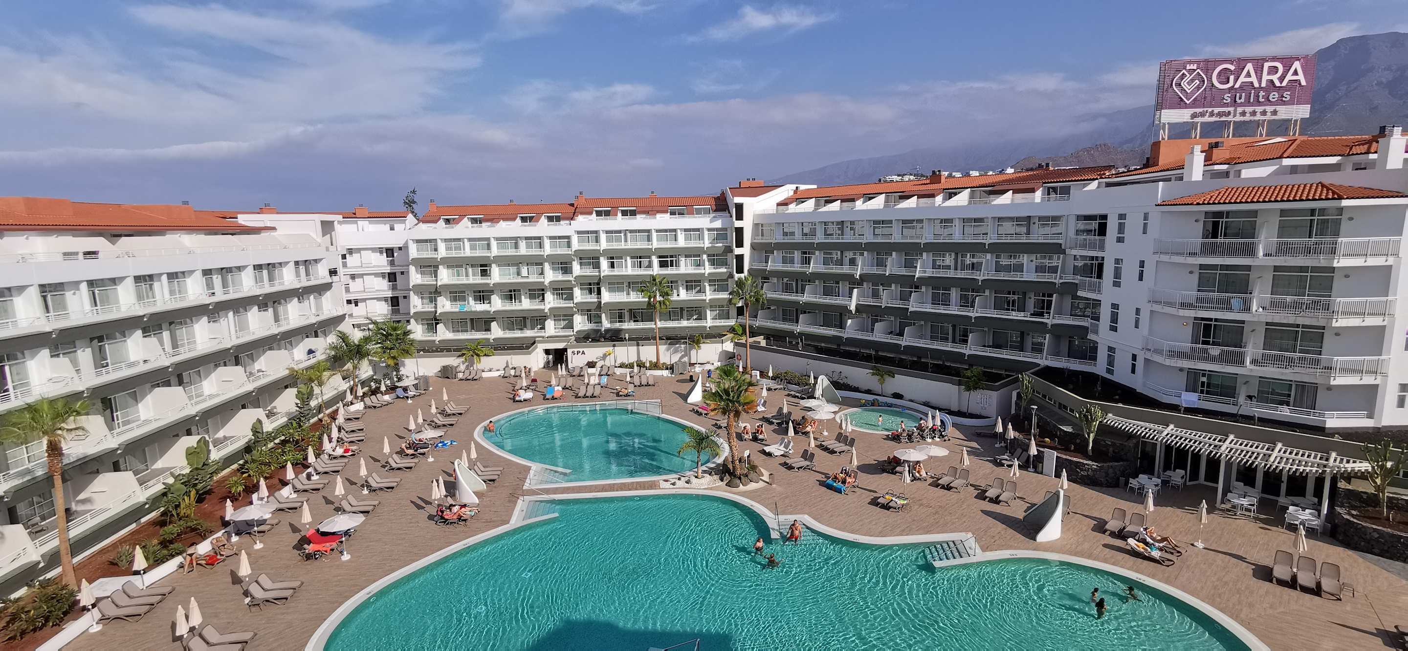 Blick von unserer Dachterrasse (Duplex Suite) auf Hotel und Poolanlage