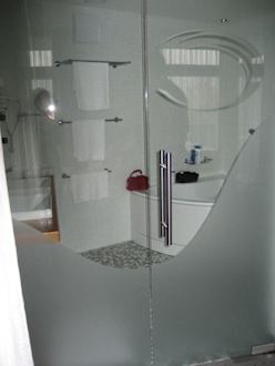 TerrassensuiteBadzimmer. Aussenansicht auf abtrennende Glasflügeltür.