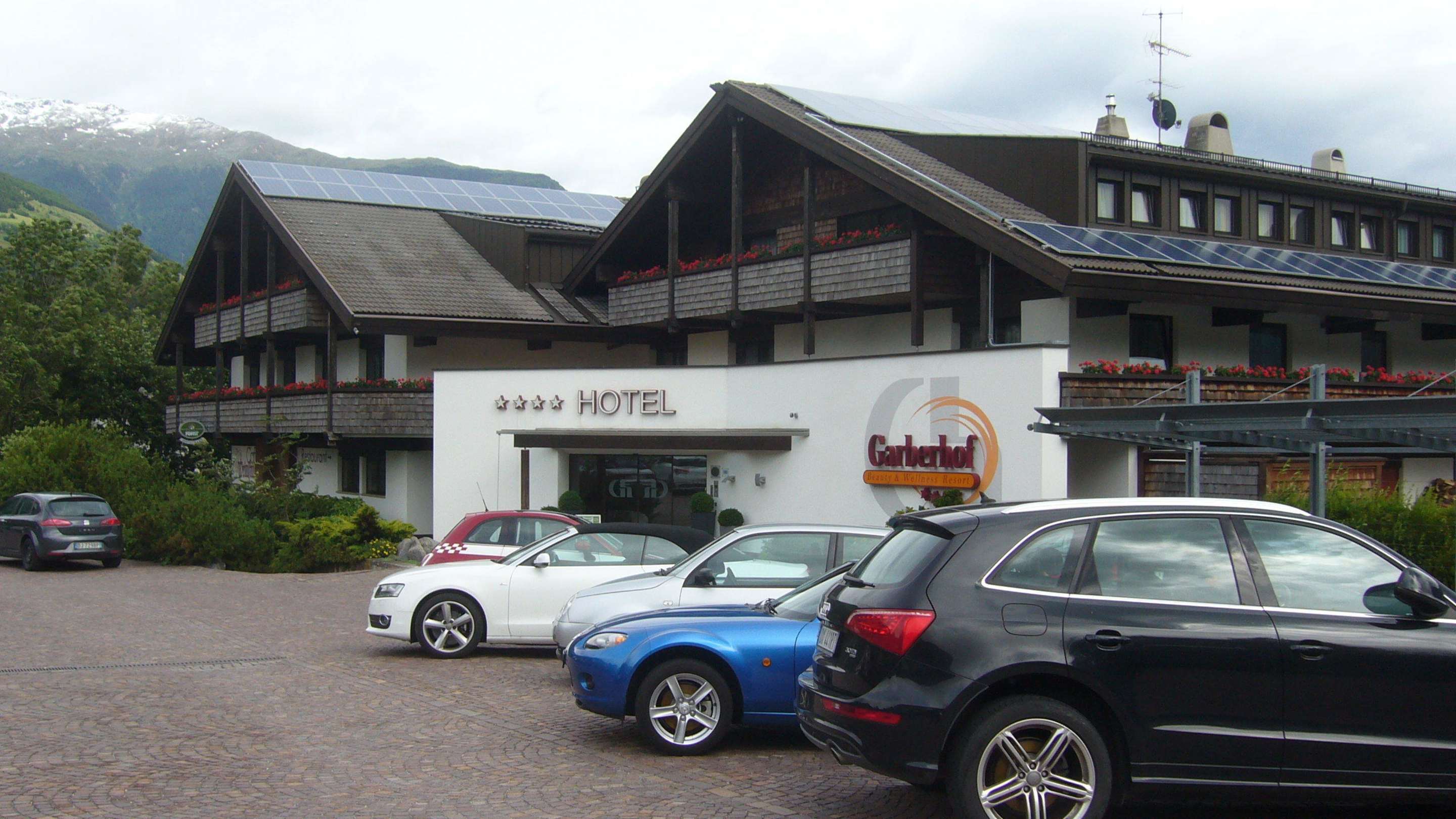 Eingang und Parkplatz Hotel GarberhofDie Aussenansicht mit Eingangsbereich sowie Parkplatz davor