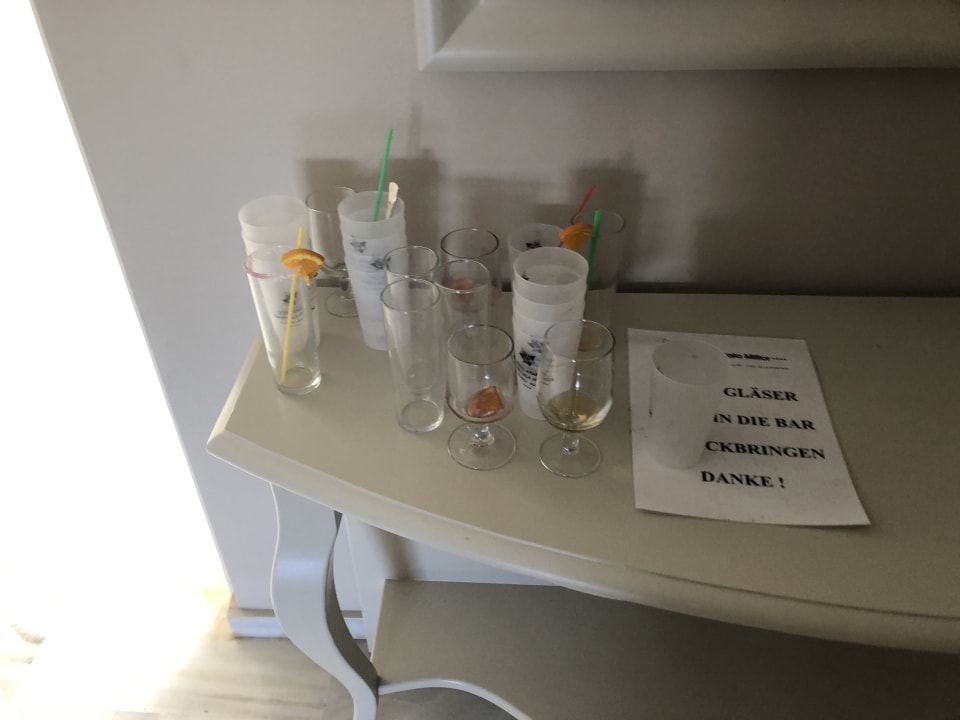 Ablage beim Treppenhaus bzw. neben den Fahrstühlen. Dort steht, dass die Gläser zurück gebracht werden sollen. Es stehen dort trotzdem täglich etliche Gläser. Die sollten dann aber auch weggeräumt werden.