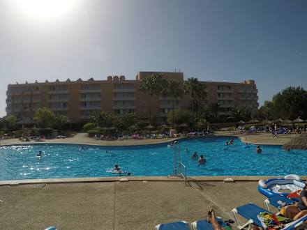 Der große Pool mit dem Hotelgebäude im Hintergrund