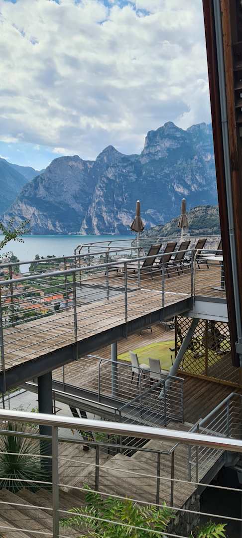 Blick vom Pooldeck Richtung Hotelzimmer und Gardasee