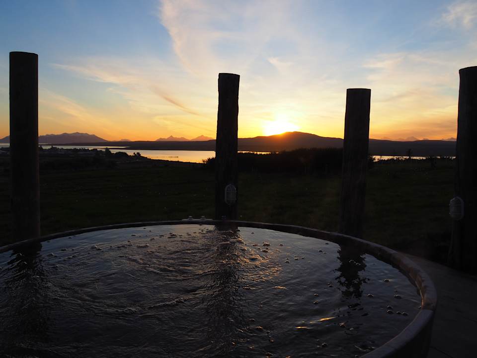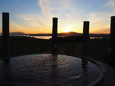 Der Whirlpool mit Blick aufs Wasser und die Berge