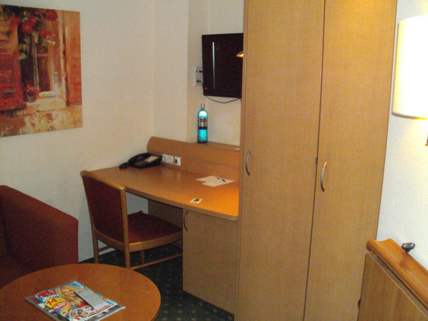Blick vom Bett auf den Schreibtisch und Schrank