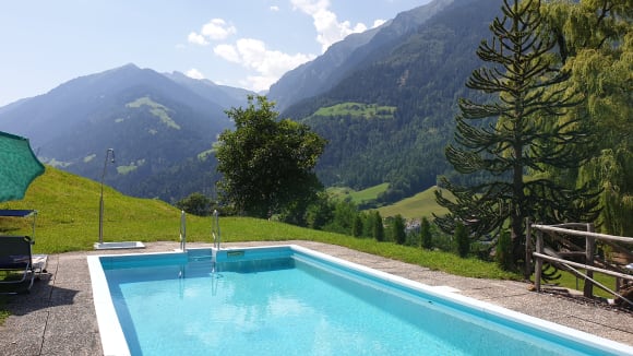 Pool vom Holzerhof mit Blick Richtung Meran.