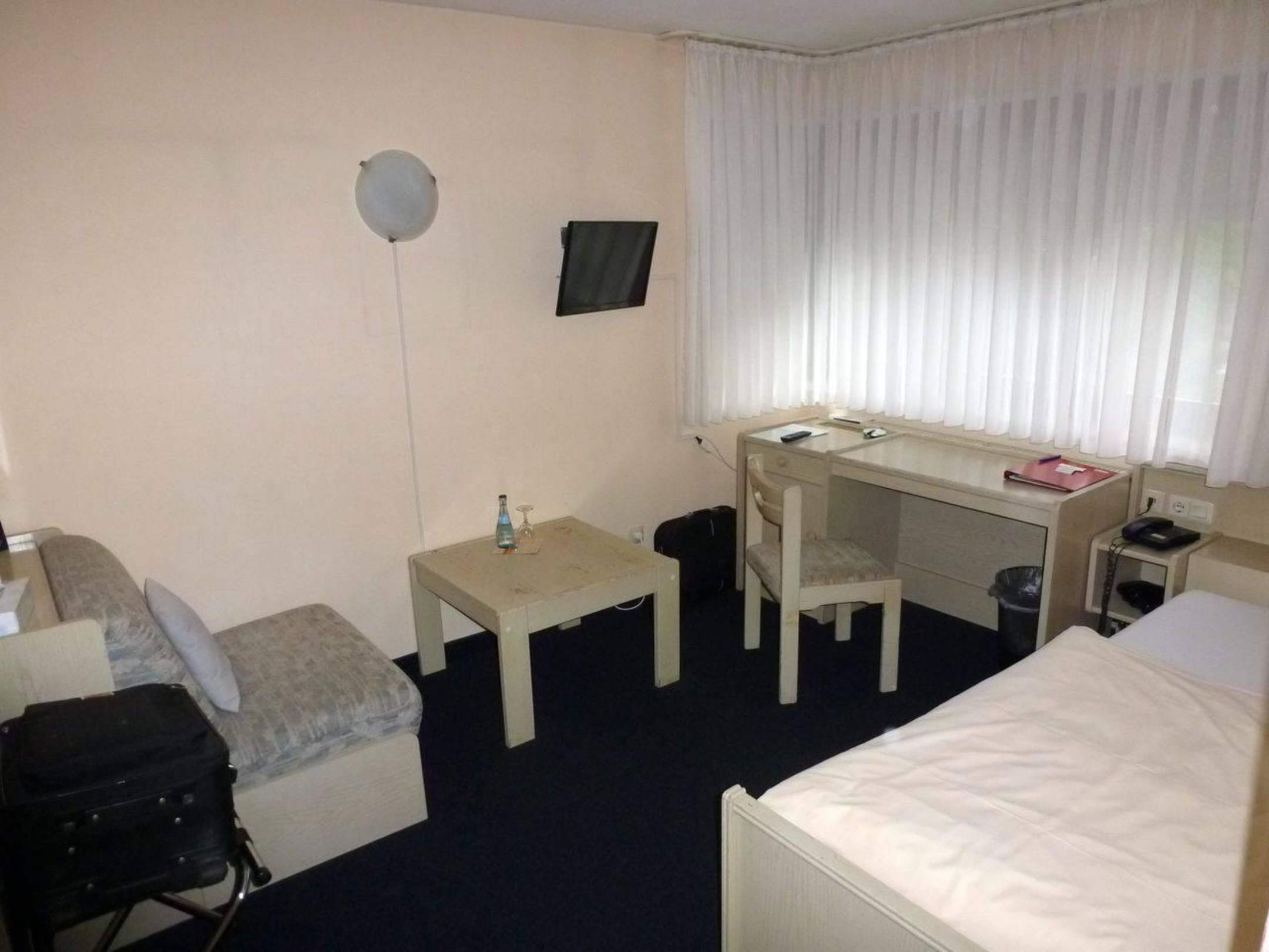 Das Eck-Fenster geht zu einer wenig befahrenen Seitenstraße raus. Das Mobiliar ist zweckmäßig gewählt, wenn auch schon etwas abgenutzt! Zu meinem Reise-Wochenende, war es in dem Hotelzimmer nachts sehr ruhig!