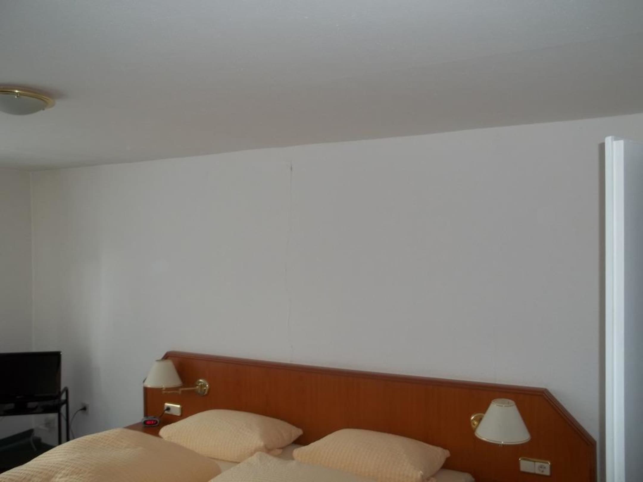 Defekte Wand über dem Kopfende des Bettes